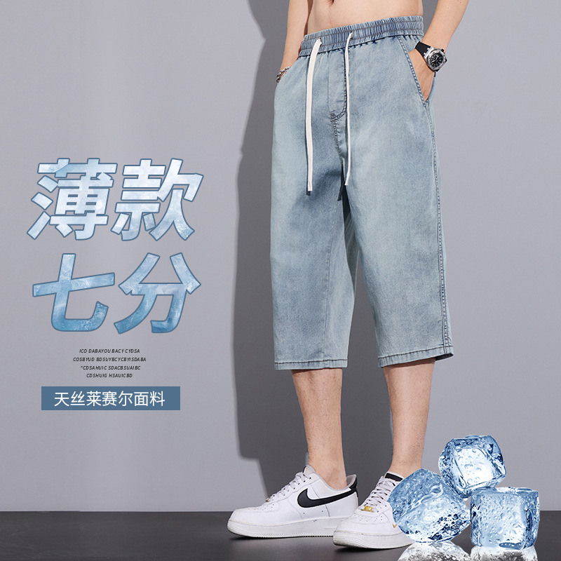 ハイエンドの夏の薄いタイプの7分のズボンのデニムのショートパンツの男性2025新型のレトロな中ズボンの男性のズボンの氷のズボン