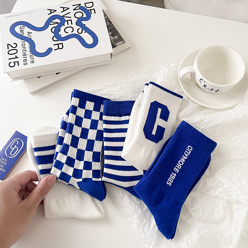 クラインの白い青い靴下の女性の中筒の靴下のinsの潮の外はネットの赤いアルファベットのチェス盤の格のストッキングの春秋の純綿を着ます。