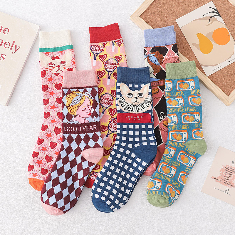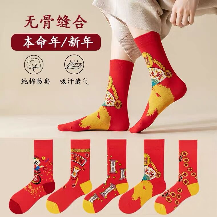 本命年赤い靴下男女中筒靴下ins潮虎年個性イラスト大赤色秋冬カップル綿靴下