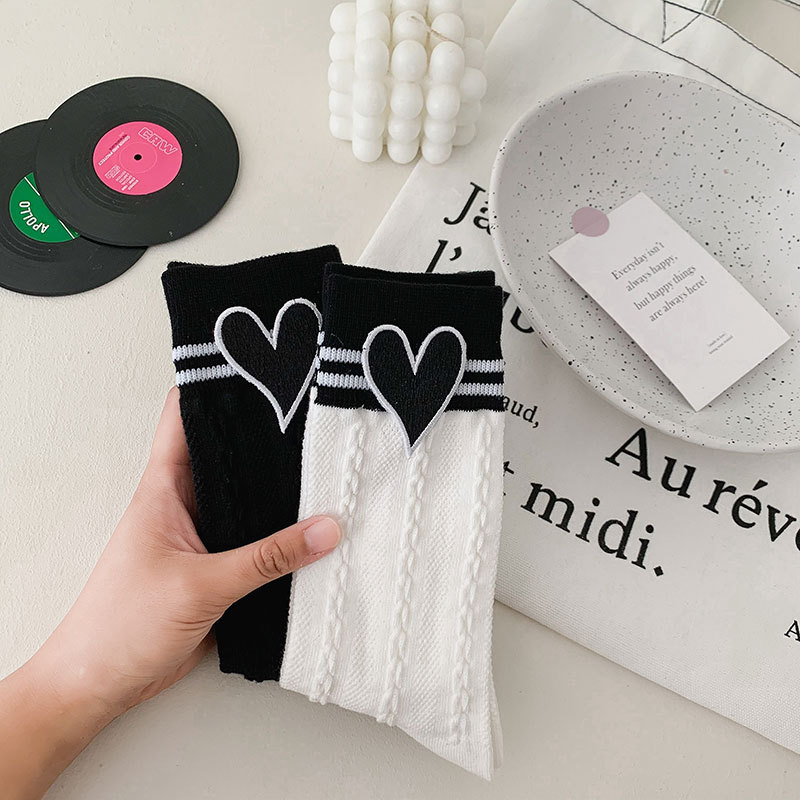 白黒の大きい愛の靴下の子供の秋の薄いタイプの純綿の黒い中筒の靴下の韓国ins潮網の赤い個性の外着