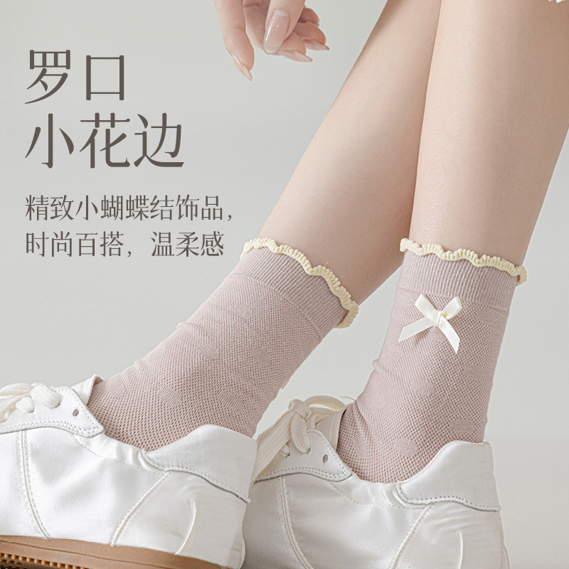 90% 綿の骨がなくて薄い足の靴下の女性の春夏JK風の蝶結びの網の目の通気性の日本の学院の風の積み重ねの靴下