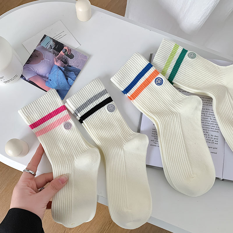 白いストライプの中筒の靴下の女性の春の夏のネットの赤い金の外はサメのズボンの2棒の笑顔の運動のストッキングの女性を配合します。