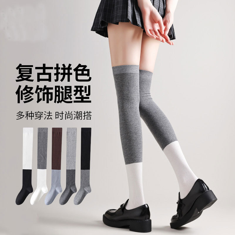 色合わせのふくらはぎの靴下の女性の灰色の春秋の金JK風の白黒は長い筒の膝の靴下の半分の足の圧力の黒い靴下をつなぎ合わせます。