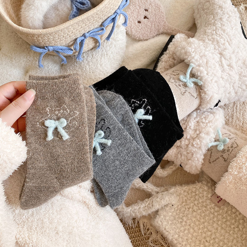 蝶結びのかわいい子猫の靴下の女性の中筒の靴下の秋冬のinsの潮は厚くて暖かいです。