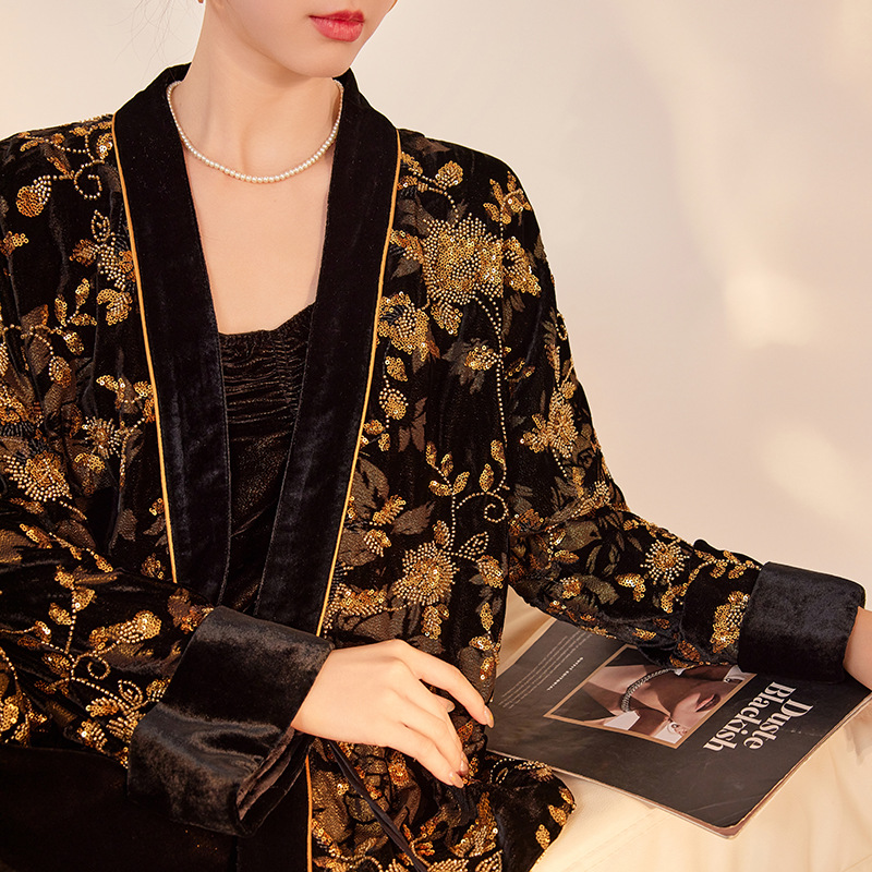 新中国風サテンの花のスパンコールジャケットの純色の軽い贅沢な雰囲気がゆったりしていて、着痩せしている上着m1609