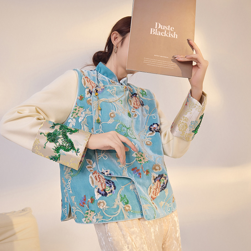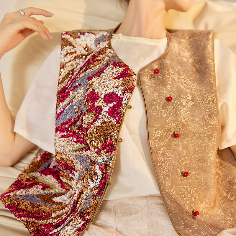 新中国風の国風サテン花柄刺繍スパンコールベストゆったりスリムフィットトップス女性用M3020文学的レトロスタイル