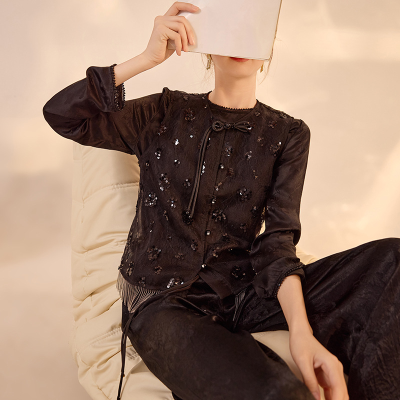 国風ファッションレースデザイン黒丸襟上着2025夏新中国式绢糸シャツ女N3066