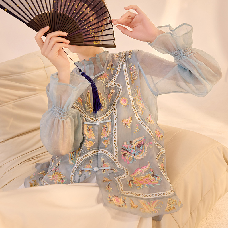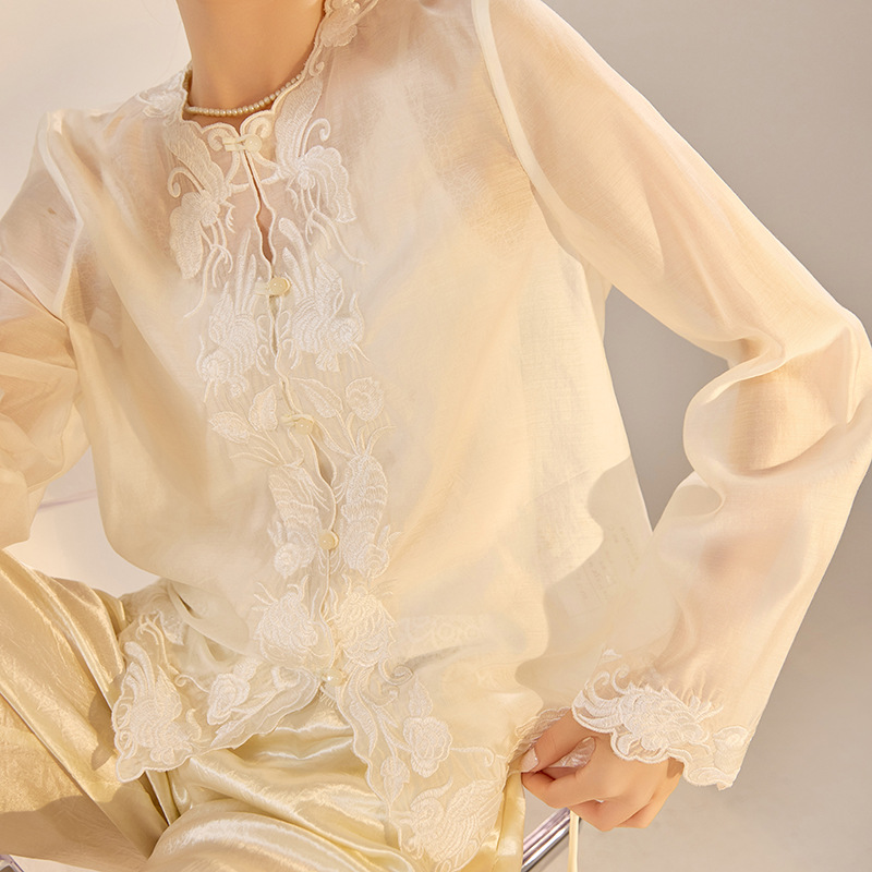 春2025新型レースデザイン上着女性国風高級刺繍新中国式绢糸シャツN2042