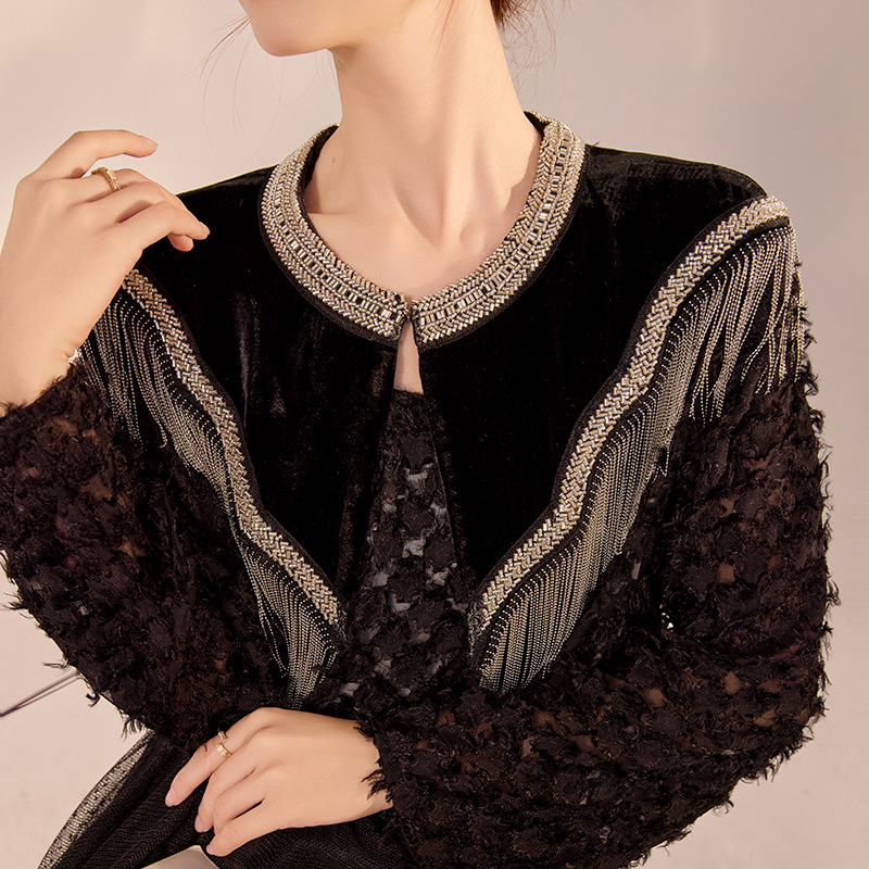 レトロ新商品高級百合チャイナドレス高貴ファッション绢糸流苏デザイン黒ストールN2056
