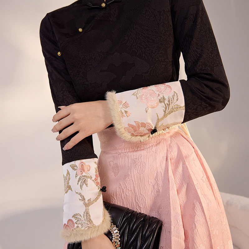 新中式レトロな民族風気質のセットアップ、スリムフィットのウエストマークトップスとピンクのジャカード織り馬面スカートLZ808、アーティスティックなスタイル