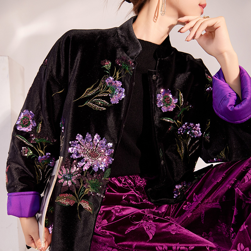 秋の新型国風新中国式刺繍スパンコールコートレトロ気質色とりどり花綿服コートMX010