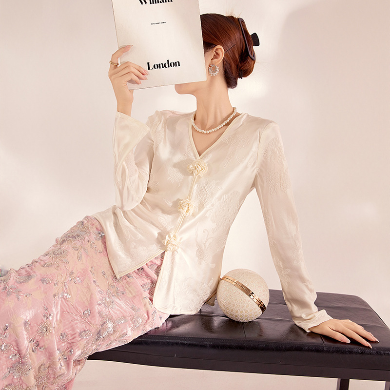 中国風初秋新作万能ビーズ刺繍長袖トップス婦人服薄手新中式レーヨンシャツ N2071