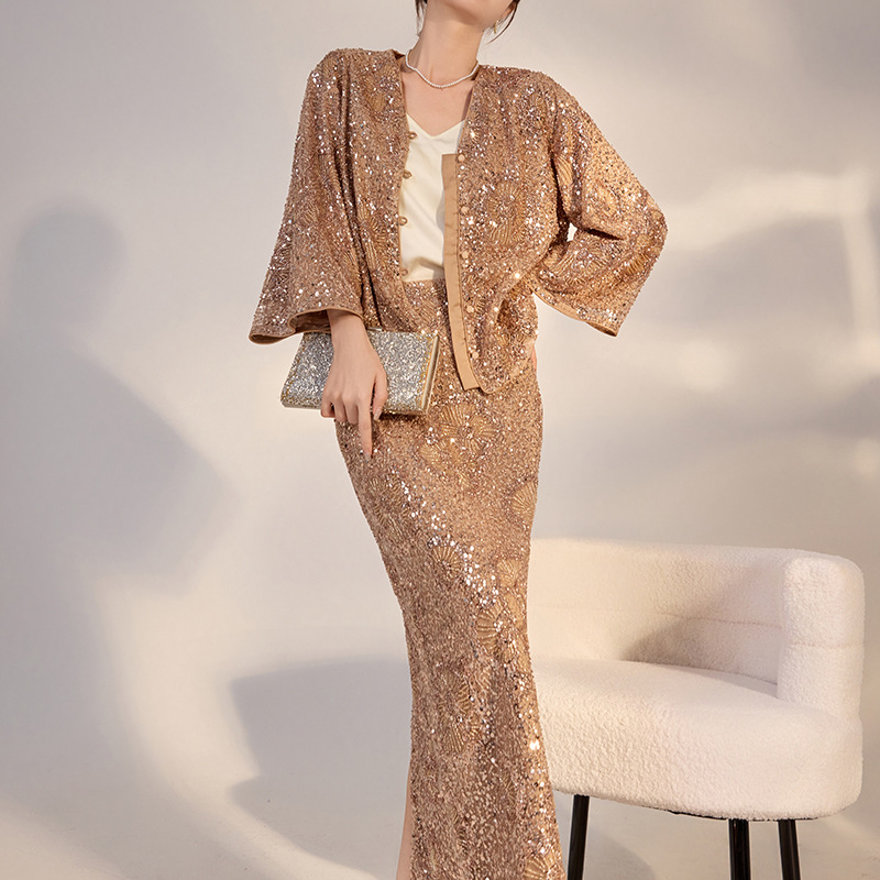 秋の新しい中国風ライトナショナルスタイル重工業スパンコールツーピースセット、キャメルカラー、ゆったり、軽くて豪華、スリムフィットスーツM3062