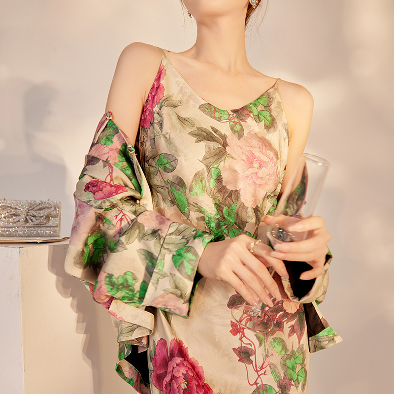 新中式風ノースリーブデザイン桑蚕糸拼接新中式風エレガント着痩せワンピース ZX型M5082
