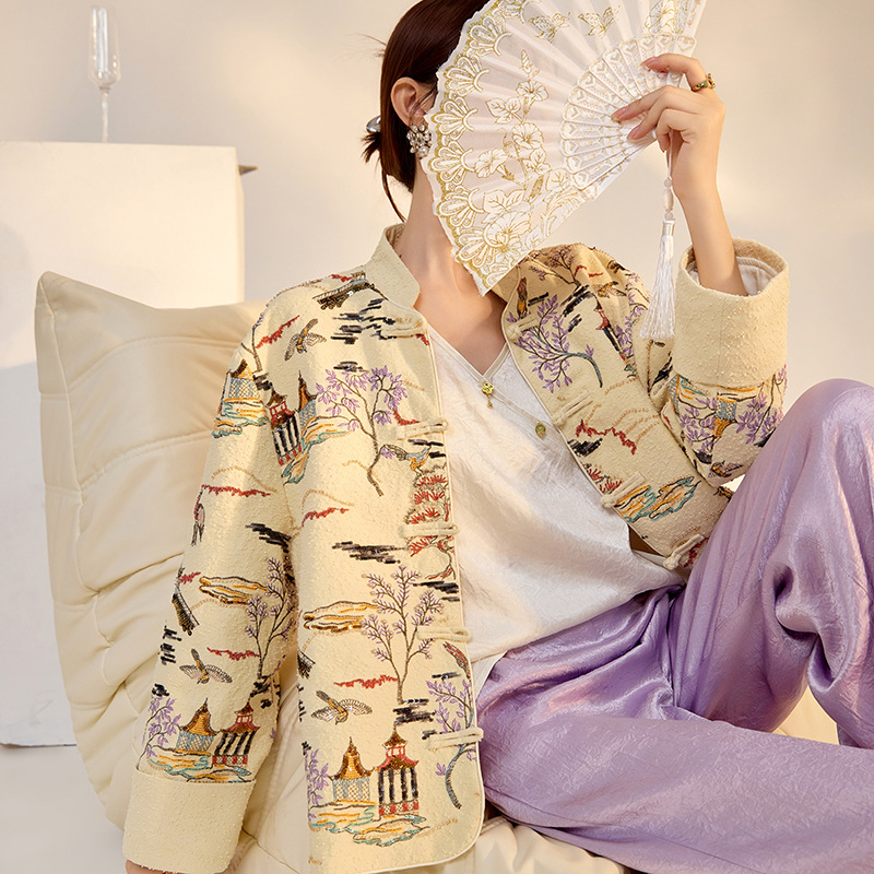 秋の新ファッション新中国風国民風トップ 2025 デザイン風景画刺繍ジャケット M6115