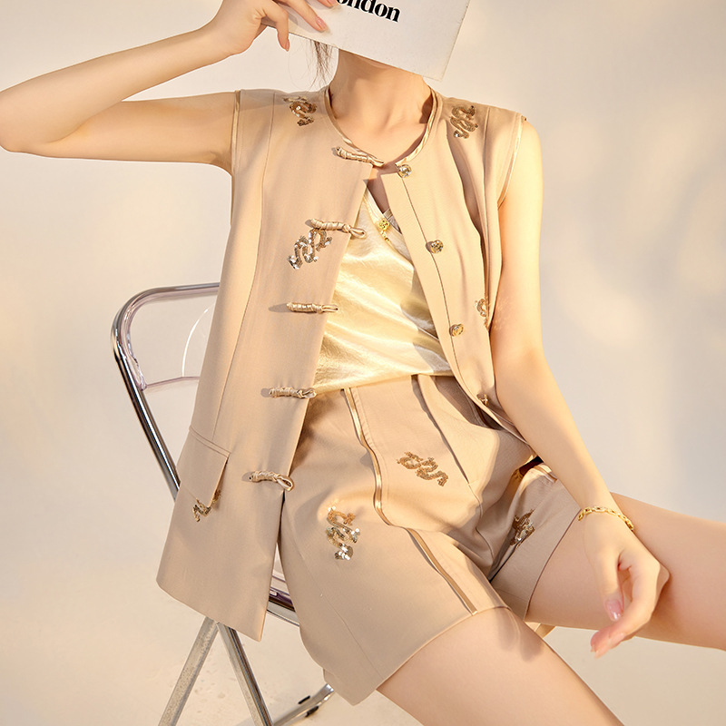 新中国式軽国風修身ファッション感2024夏気質盤バックル馬甲半ズボン女性2セットm4 184
