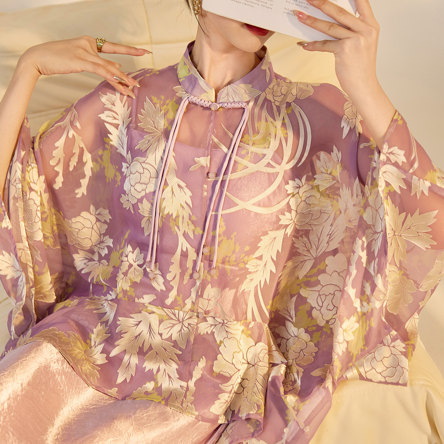 新中国式の薄いレンコンのピンクの绢糸のシャツの夏の薄いモデルの高级重工の刺繍のゆったりしている上着M6032