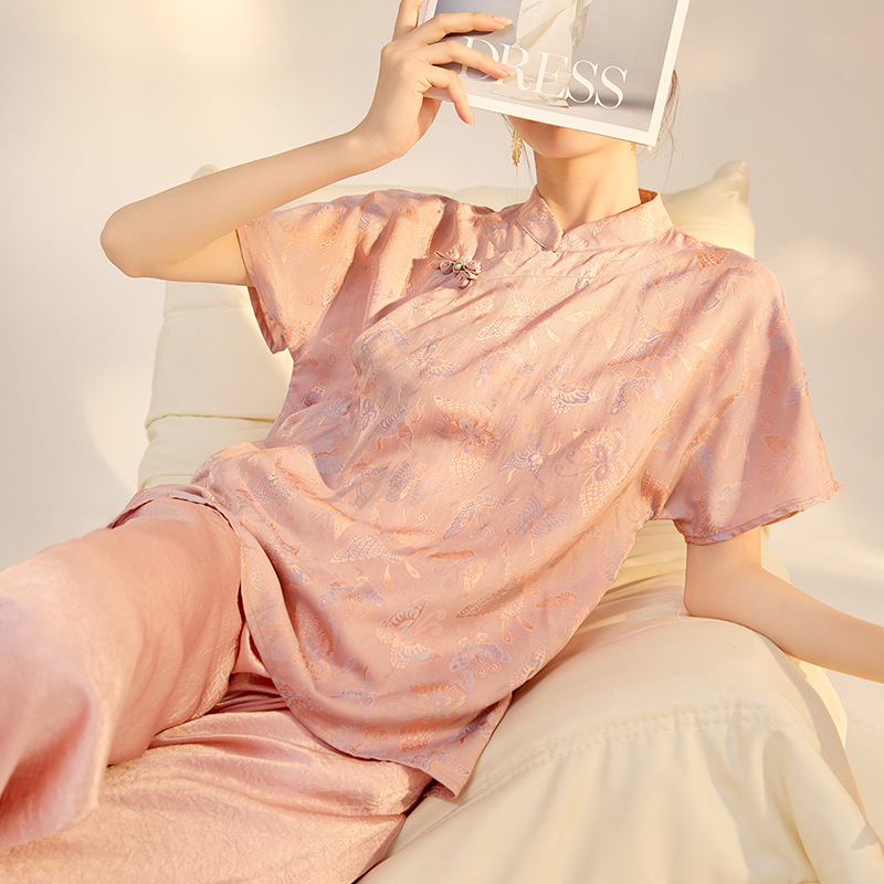 中国風蝶ネクタイ襟半袖レーヨンシャツ レディース 新中式国民風ファッション エレガントTシャツ ZX型M602