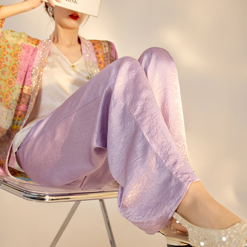 中国風新中式無地エレガントアセテートカジュアルパンツ 夏用ストレートロングパンツ レディースM5162 ハイウエスト着痩せ