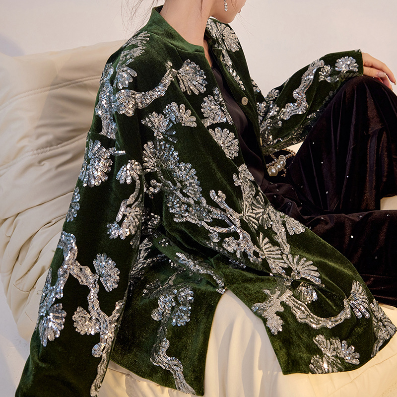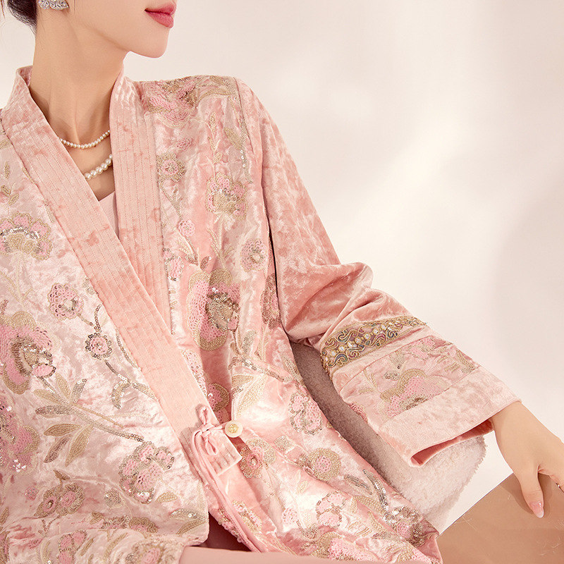 2025年冬 国風ベルベットボタン付きトップス 新中式花柄スパンコールレトロ風ジャケット 中綿入りM3016