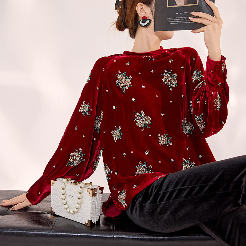 中国風冬2025新作 花柄刺繍とビーズ装飾デザインシャツ おしゃれなラウンドネック桑蚕糸トップス MZ005