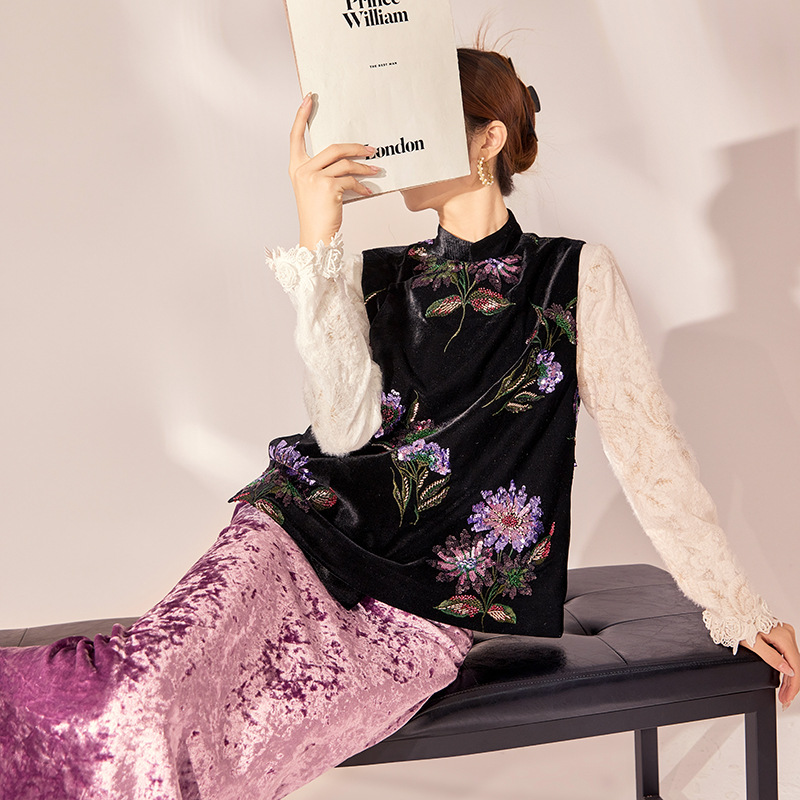 新中式2025新作 国風スパンコール刺繍デザイン 留め具付きスタンドカラーデザインシャツベスト MZ064