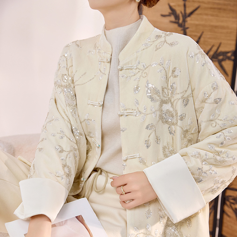冬の新しい中国式の優雅な気質のスパンコールの刺繍の長袖のコート2025新型の国風の設計の綿の服MY054