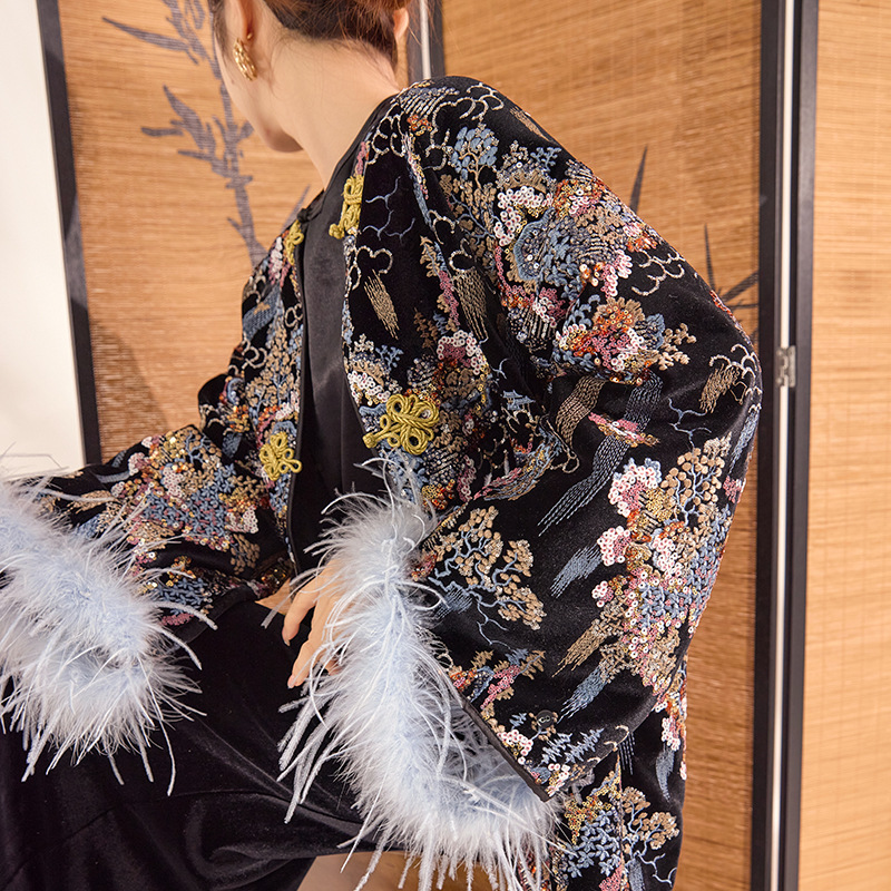 新中国式2025春新作気質盤ボタン上着重工スパンコール刺繍ダチョウ毛袖コートmz81