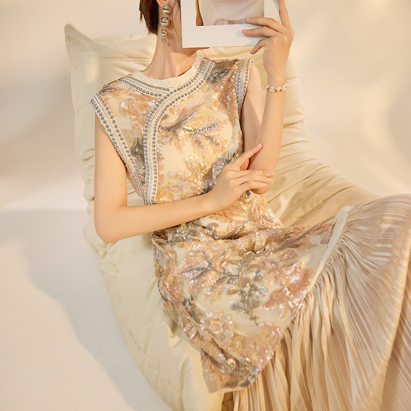 2025 夏の新しいレトロな中国風のビーズ刺繍ドレス新しい中国風のハイエンド A ラインスカート女性 N6022