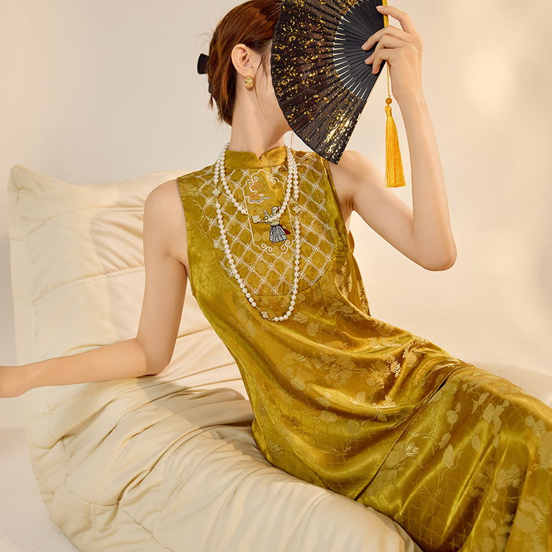 夏の新作、中国風の切り替えデザインワンピース、女性用新中式高級刺繍改良旗袍ロングドレス N4073