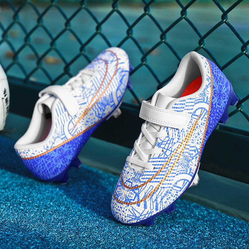 外国貿易の新型子供のマジックテープの長い釘の靴の子供のサッカーの靴のゴムの釘のC羅は大きいサイズの晋江の靴を訓練します。