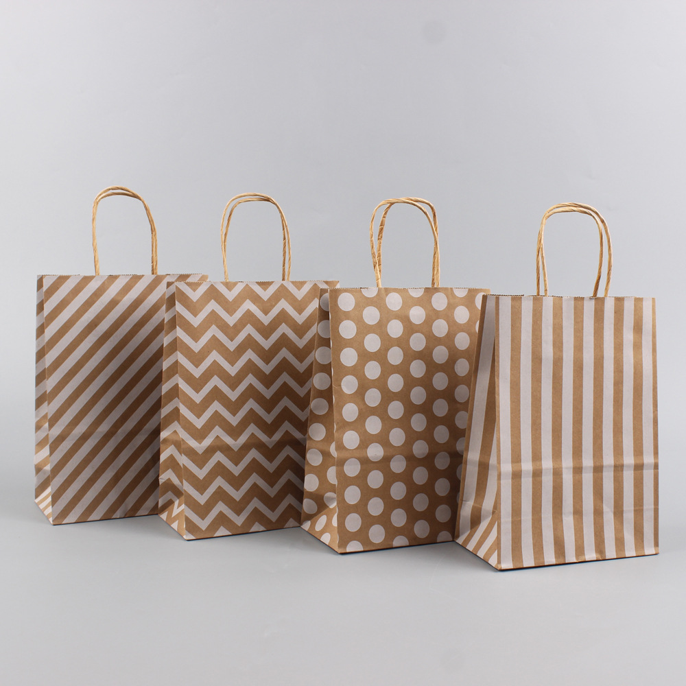 現物は国境を越えたアマゾンのクラフト紙の白い大きな丸い点の波のツイルの縦縞の卸売りの贈り物の袋を供給します。