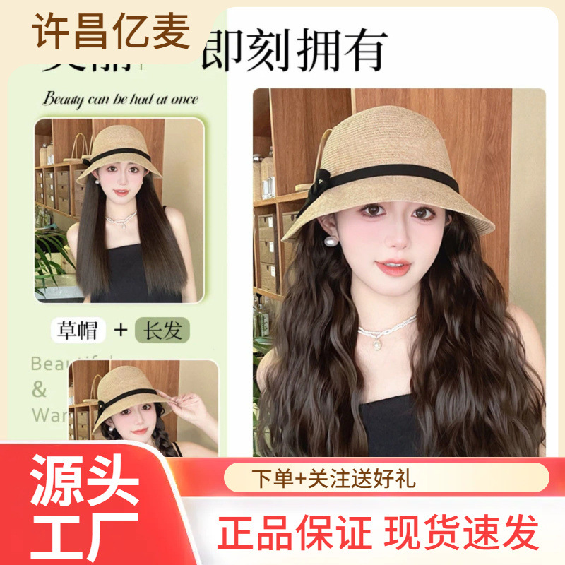 編み込みラフィットハット一体型日よけ日焼け止め夏ファッション気質リゾートフィッシャーマンハット女性用ウィッグ