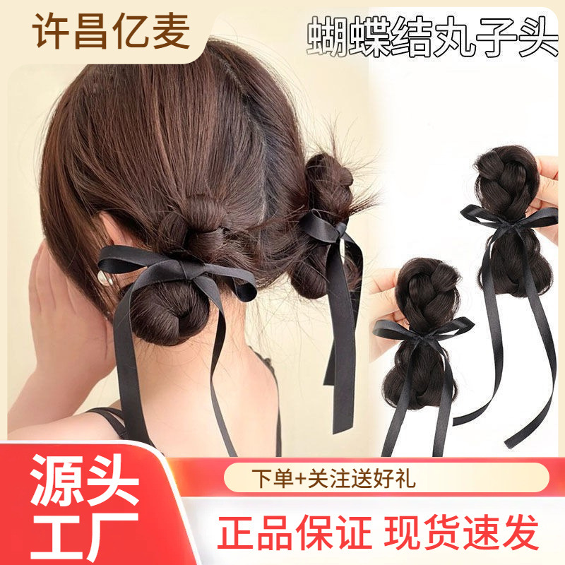 韓国の黒リボン模擬女の子ヘアバッグ、同じ甘くてクールなスタイルのクリップ、リボンのつぼみ、ダブルボールヘッド