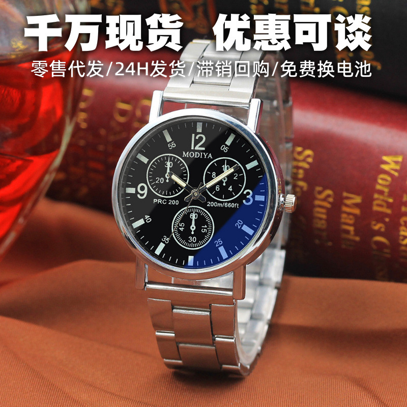 ホットモデルmodiya三眼鋼帯男性腕時計卸売りブルーレイ鏡面石英腕時計メーカー直営