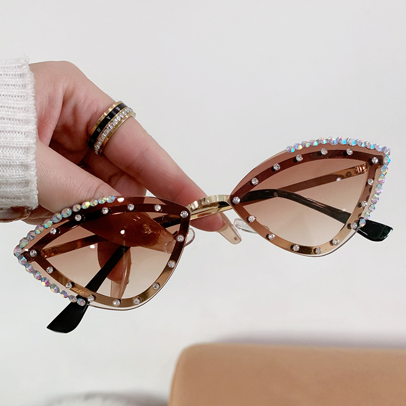新型の欧米のまぶしい色は枠なしでダイヤモンドの猫の目のサングラスのネットの赤い同型の街を入れてショーの個性を撮影してサングラスを飾ります。