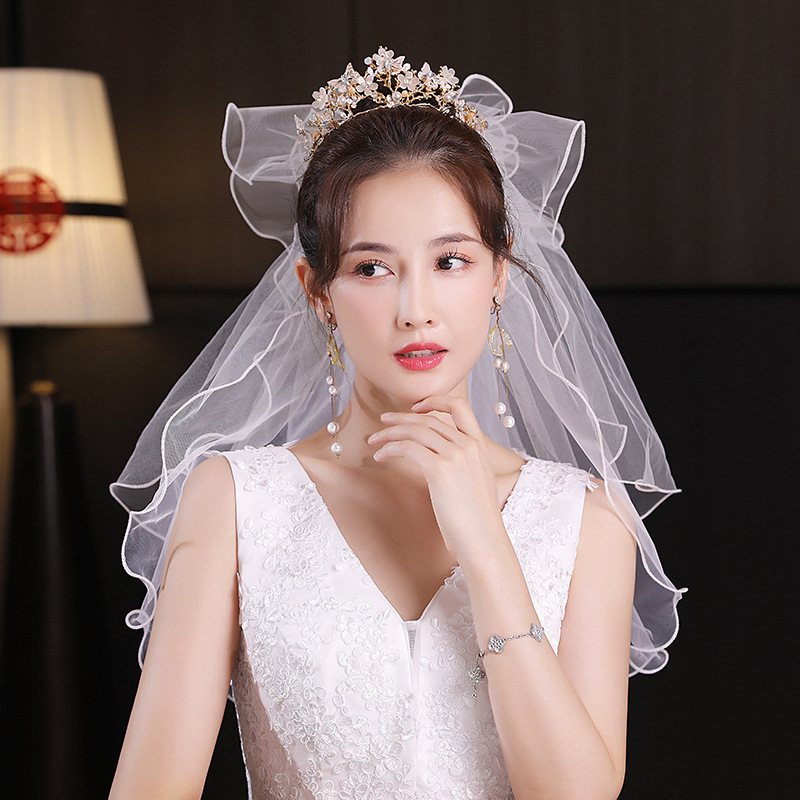 新型の白い新婦の頭の紗は顔の多層の短い金を覆います。