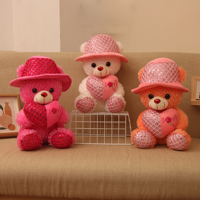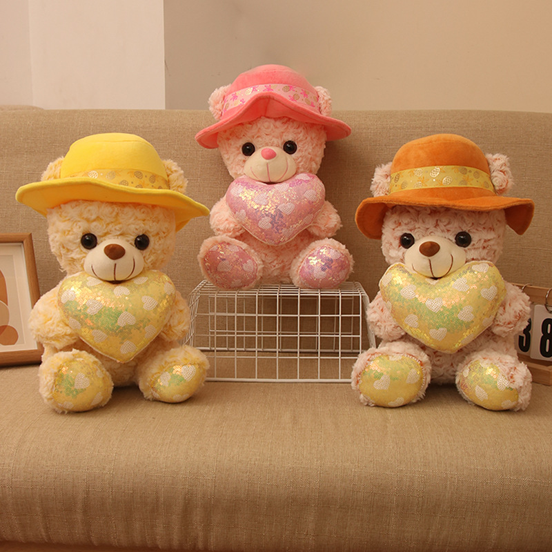 新しい帽子をかぶったテディベアは心のスパンコールを抱いています。