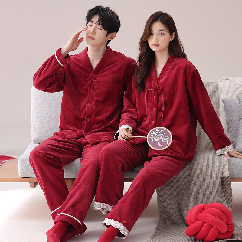 パジャマカップル服冬のサンゴのベルベットの厚いベルベットの赤い結婚新婚フランネルの家庭服セット