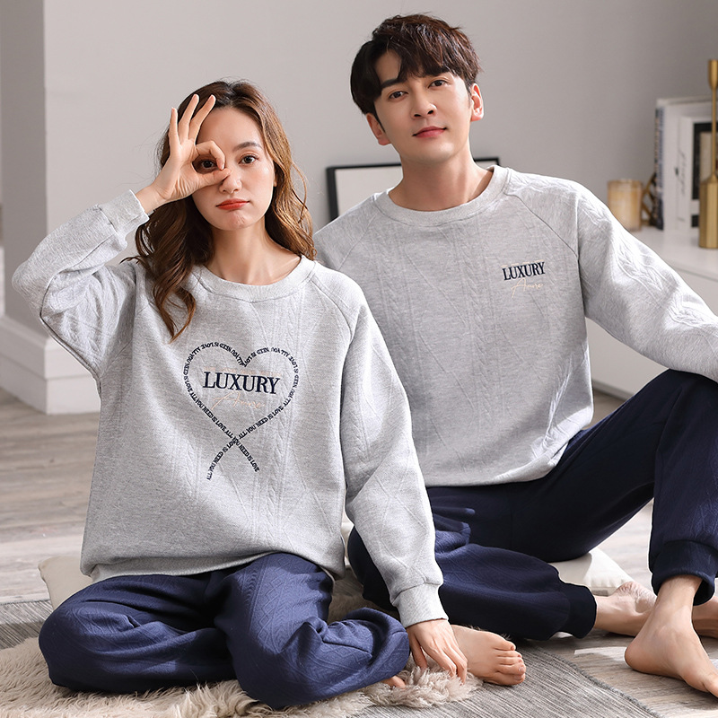 カップルパジャマ秋冬純綿サンドイッチ女性丸首カバー