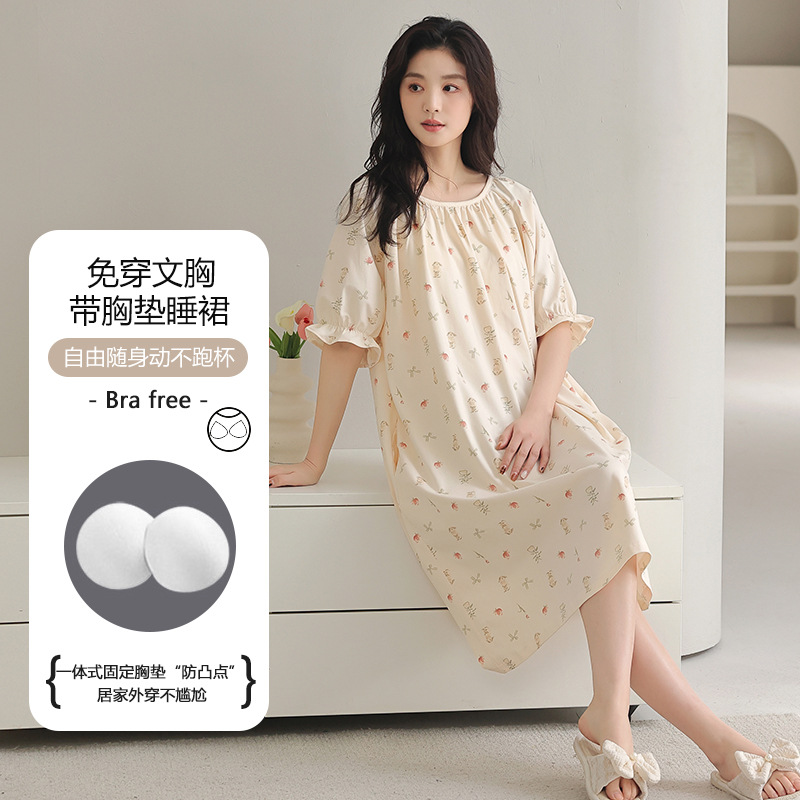 胸パッド付きパジャマ女性夏の新型モーデール砕花ワンピース丸襟ゆるい大サイズプリンセス風寝スカート