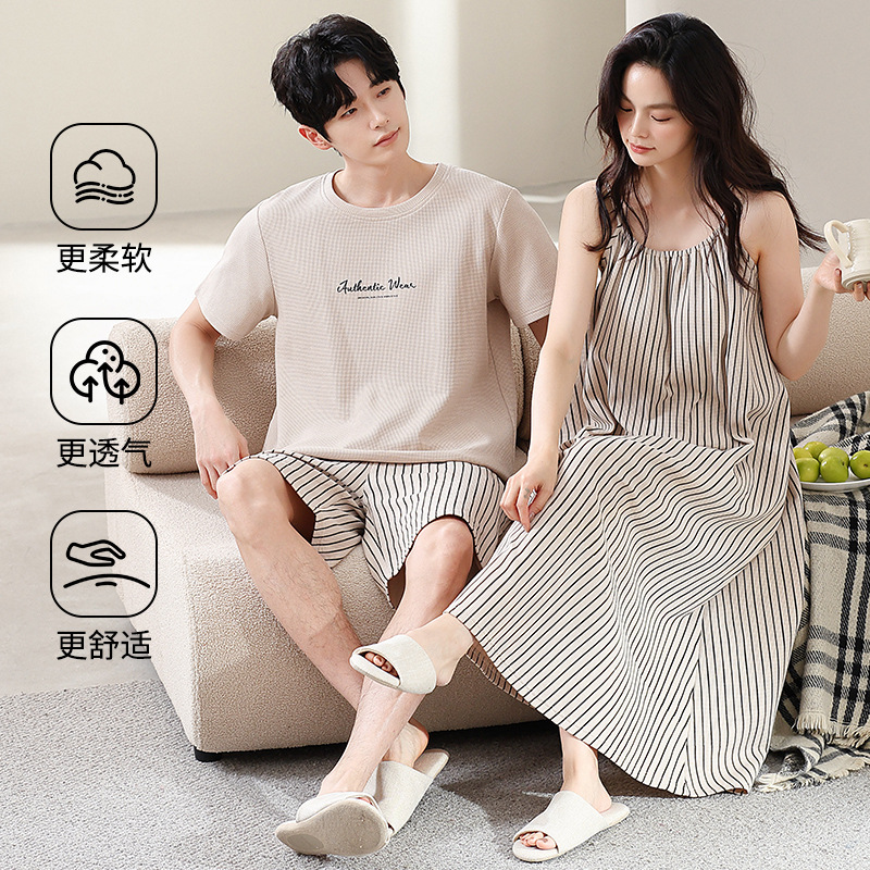 カップルパジャマ夏純綿半袖ホームウェア男性ノースリーブストラップワンピースロングスカートコットンワッフルスーツ