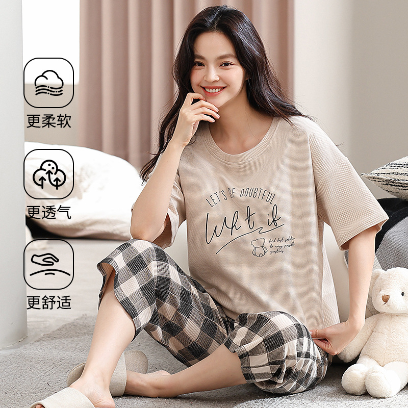 新しいパジャマ夏の純綿ワッフル半袖丸首の大きいサイズは7分のズボンの綿の家の服のスーツを着ることができます。