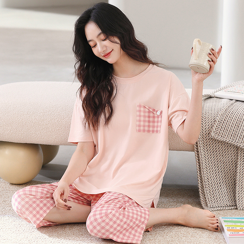 爽やかな綿のパジャマの女性の半袖の夏の薄い色の純色の7分のズボンの新型は純綿の家庭服のスーツを着ることができます。