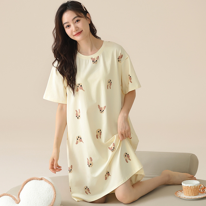 純綿のパジャマの女性の夏の薄い半袖のワンピースの漫画の少女の丸首は綿の女性の家の服を着ることができます。