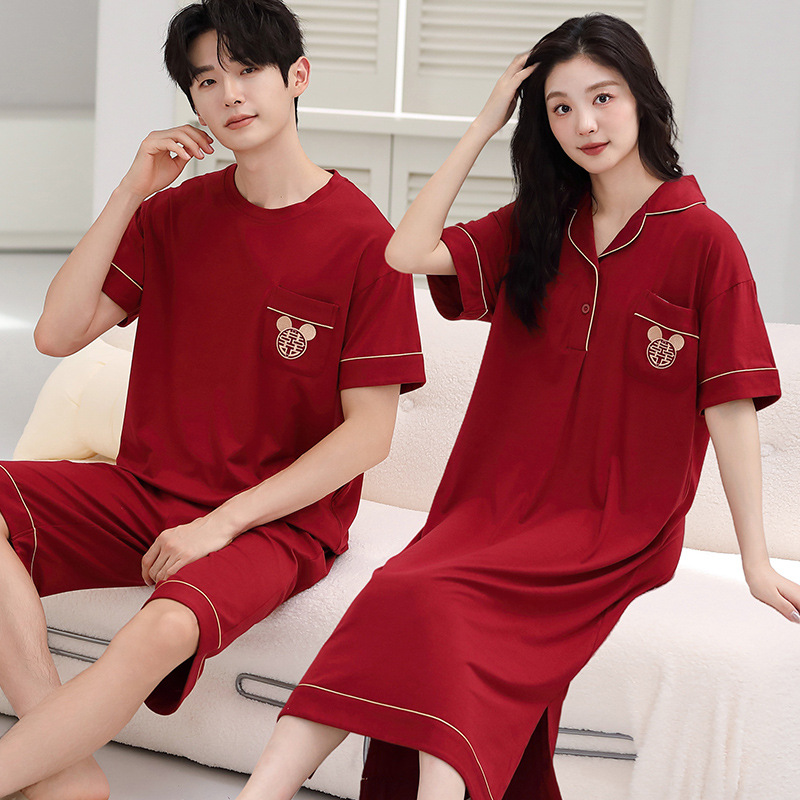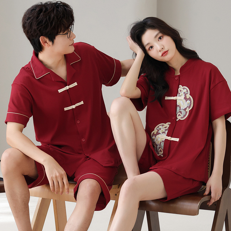 結婚カップルパジャマ春夏半袖純綿パジャマ女性赤い本命年男性襟付きホームウェアセット