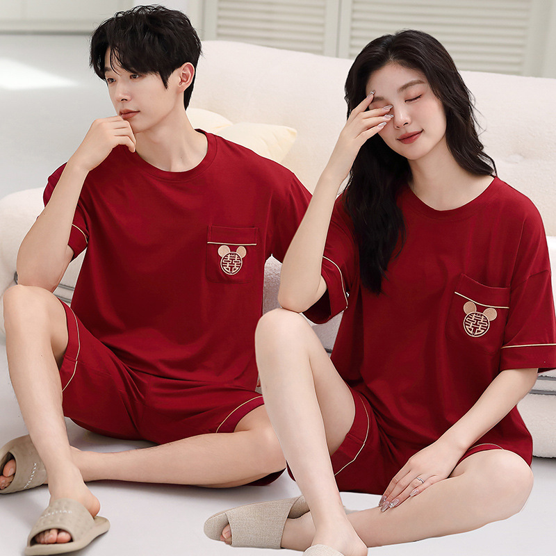 新婚結婚カップルパジャマ夏純綿本命年赤半袖半ズボン国風祝いホームウェアセット
