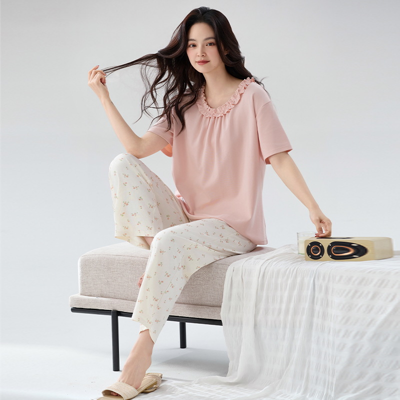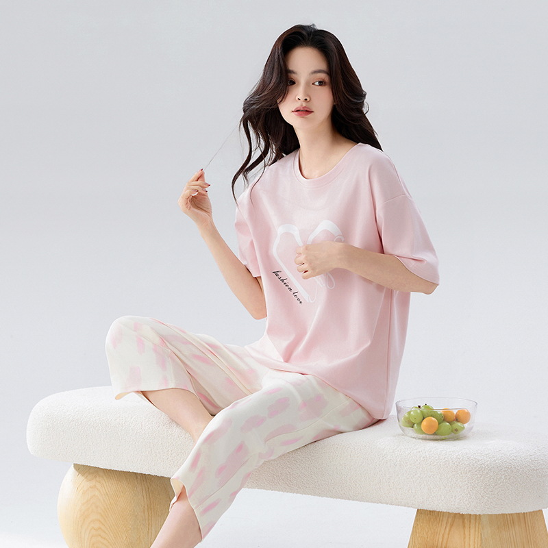 7a抗菌純綿パジャマ女性夏の薄手半袖七分ズボン砕花全綿家庭服セットは外着ができます。