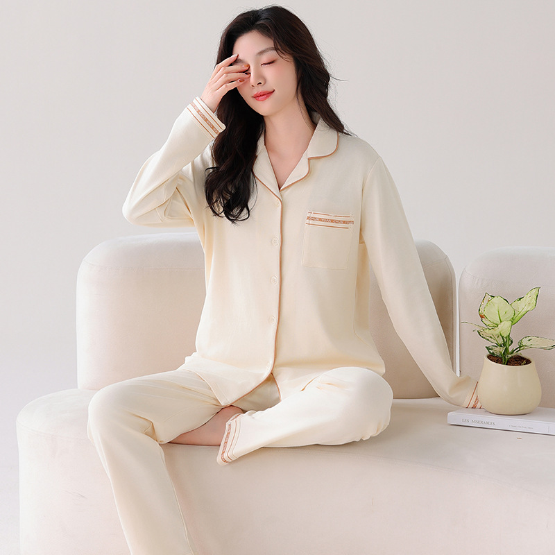 純綿パジャマ女性の春と秋の新しい襟付き長袖は、女性の大きいサイズの綿の家庭服セットを着ることができる