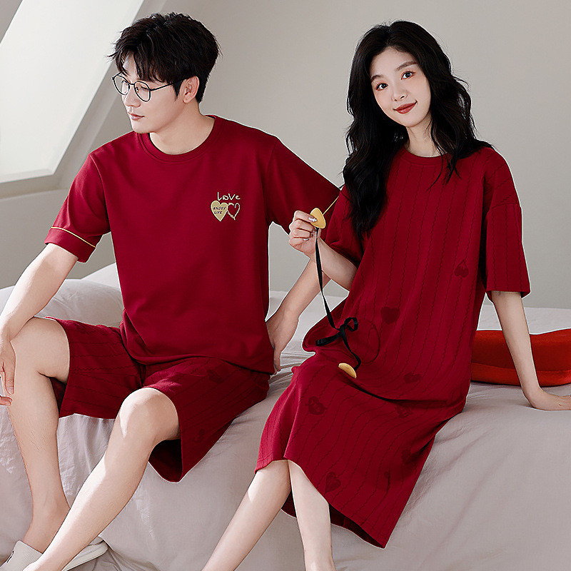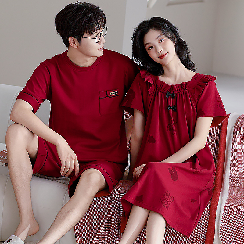 カップルパジャマ夏の新型半袖男性ホームウェア大赤色本命年丸襟大サイズ純綿ワンピース